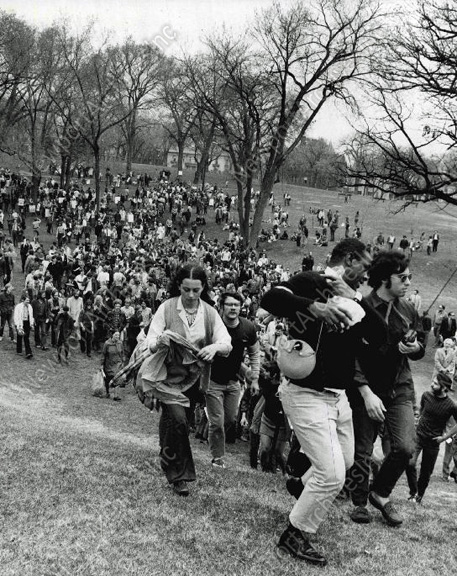 Joe Blade of the Minneapolis Star reported that the chaos that became the riot of April 28, 1970, started as a rally staged the night before at Macalester College. And that really started when several hundred sympathizers greeted every passenger on Jerry Rubin’s plan with cheers when it arrived at MSP Airport. It that enthusiasm continued at a press conference at which pacifist Stewart Meacham removed his coat, tie, and shirt because Rubin had said that people in coats and ties were not brave enough to bring about a peaceful world. Unclear how that’s written whether it was Meacham or Rubin’s coat, tie, and shirt that was removed…